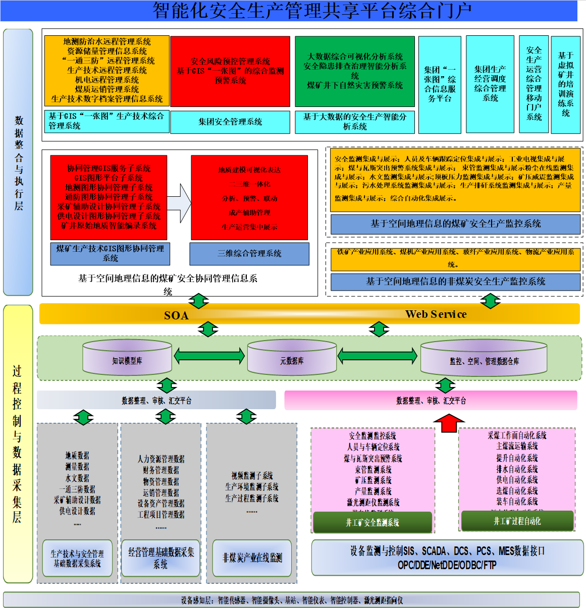 “智能化(hua)安全生产(chan)管理(li)平台”作为一(yi)个以业(ye)务(wu)为中(zhong)心(xin)的(de)系统框架,使得(de)生产(chan)业(ye)务(wu)及(ji)管理(li)部(bu)门“看得(de)到(dao)、管得(de)着、控得(de)住”,提升(sheng)各(ge)部(bu)门间(jian)的(de)横向整(zheng)合(he)以及(ji)各(ge)级(ji)管理(li)部(bu)门间(jian)的(de)纵(zong)向集成。总体架构设(she)计有三层重要含义: