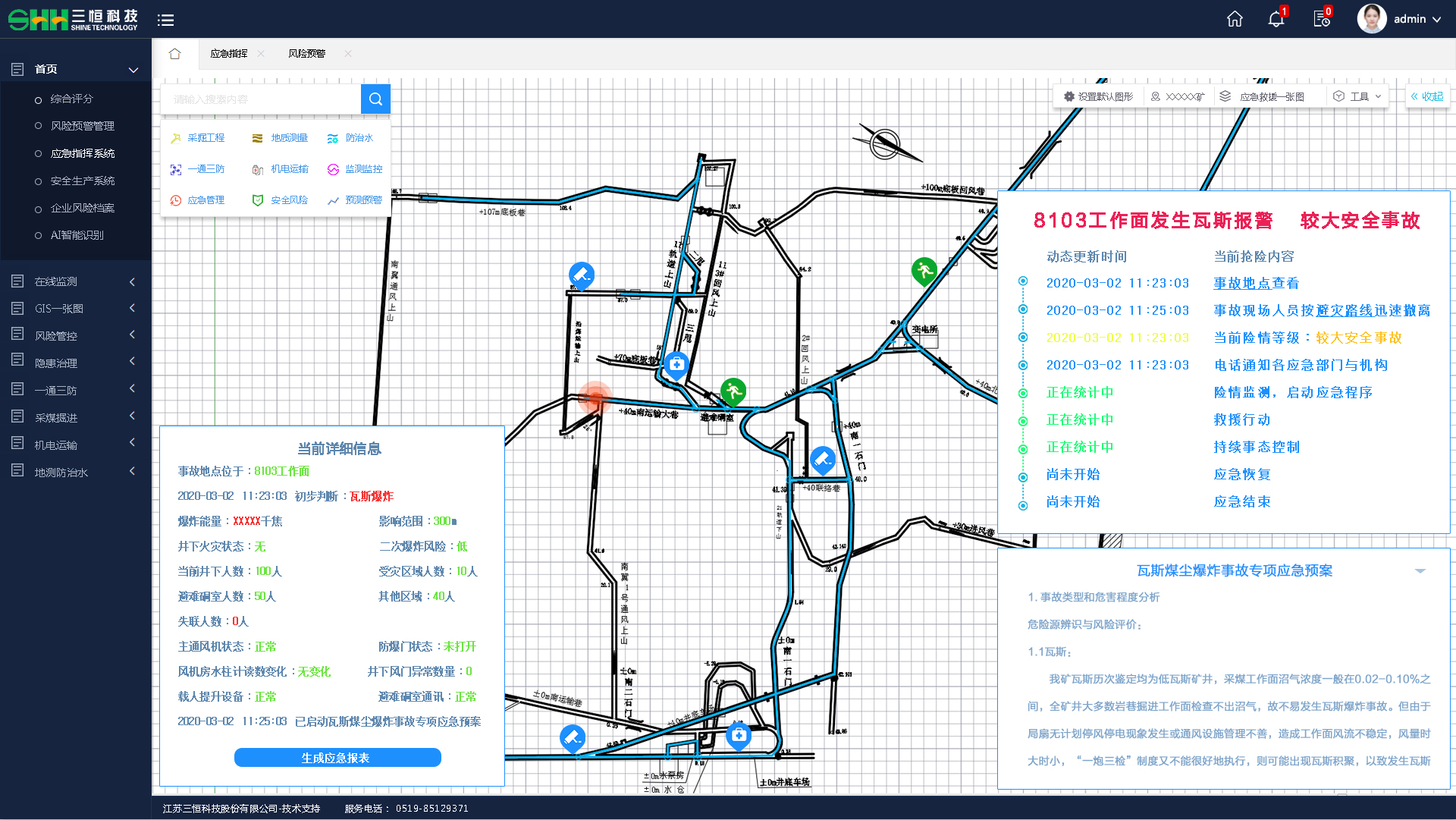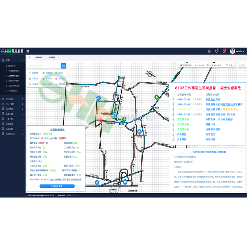 系统能够在煤矿(kuang)发生(sheng)事故时(shi),弹出相关报警信息(xi),并同时(shi)显(xian)示(shi)事故区域环境和(he)(he)人员(yuan)情况(kuang),启(qi)动(dong)应急预案,按照预案弹出应急机构、专家(jia)和(he)(he)队伍(wu)通(tong)讯录,避灾路线图,并方便地调出相关各类(lei)图纸资(zi)料,同时(shi)集成各类(lei)通(tong)信手段(duan)(调度电话、工业视频(pin)、短(duan)信和(he)(he)记录工具(ju)等),为应急救(jiu)援(yuan)提供支持,满足应急救(jiu)援(yuan)指挥的需要。