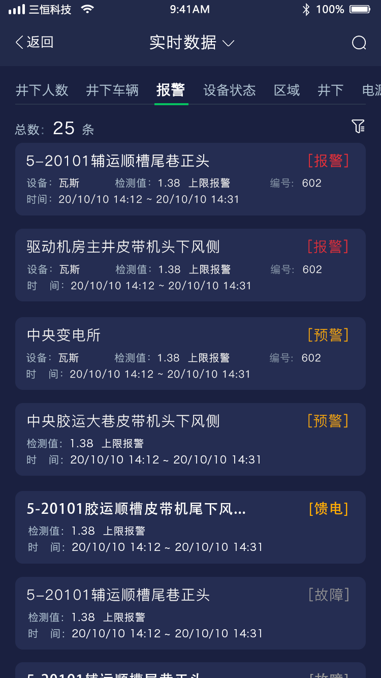提供整個煤礦報(bao)警(jing)信(xin)息的(de)統計及查(cha)看(kan)入口,如礦上有報(bao)警(jing)或者故障(zhang)信(xin)息,會第一時(shi)間(jian)推送(song)到用戶手機上。