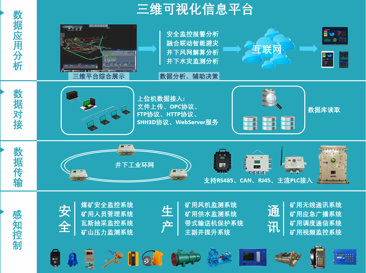三维可视(shi)化(hua)综合(he)信(xin)息(xi)平台(tai)使用虚拟现(xian)实(shi)技术与(yu)煤矿(kuang)信(xin)息(xi)化(hua)系(xi)统相(xiang)结(jie)合(he),通过(guo)三维仿真(zhen)场景显示全矿(kuang)井数据信(xin)息(xi),系(xi)统可以将煤矿(kuang)已(yi)有(you)的安全监控(kong)系(xi)统、人(ren)员管理(li)系(xi)统、应急(ji)广播系(xi)统、视(shi)频监控(kong)系(xi)统、煤矿(kuang)采、掘、机(ji)、运(yun)、风、水(shui)、电自动(dong)(dong)化(hua)控(kong)制等多(duo)个子系(xi)统融(rong)合(he)在一起,实(shi)现(xian)数据分析、应急(ji)联(lian)动(dong)(dong)等功能(neng),为(wei)调度、指挥、决策的科学性提供数据支撑。