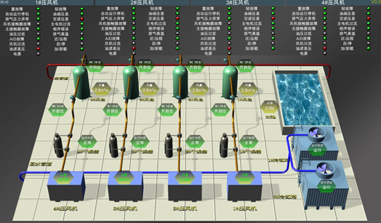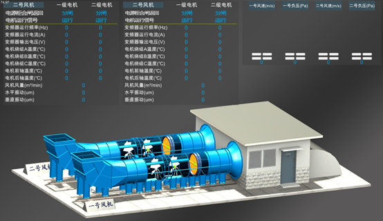 平(ping)台可以实时显(xian)示风量,风压(ya)(ya),电(dian)(dian)机(ji)电(dian)(dian)压(ya)(ya),电(dian)(dian)机(ji)电(dian)(dian)流(liu)(liu),电(dian)(dian)机(ji)故障,开停,电(dian)(dian)机(ji)表面温度(du)等数(shu)(shu)据(ju)或(huo)状态(tai)。数(shu)(shu)据(ju)显(xian)示具有闪(shan)(shan)烁(shuo)、颜(yan)色变(bian)化(hua)、显(xian)示隐(yin)藏等动画(hua)效(xiao)果。图形动画(hua)具备电(dian)(dian)压(ya)(ya)超限闪(shan)(shan)烁(shuo)报(bao)(bao)警(jing)、电(dian)(dian)流(liu)(liu)超限闪(shan)(shan)烁(shuo)报(bao)(bao)警(jing)、温度(du)超限闪(shan)(shan)烁(shuo)报(bao)(bao)警(jing)、流(liu)(liu)程控制动画(hua)显(xian)示等功(gong)能。同(tong)时,各开关量状态(tai)具备颜(yan)色变(bian)化(hua)及报(bao)(bao)警(jing)功(gong)能。