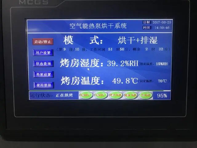 步驟二:新鮮山楂片的含水率約為80%,干燥的目標(biāo)含水率約為13%,使用空氣能熱泵型烘干機(jī),將智能溫度設(shè)定為55攝氏度左右的范圍,使山楂片所含的游離水大量蒸發(fā),熱風(fēng)循環(huán)系統(tǒng)不斷輸送新風(fēng),將風(fēng)量均勻的輸送至各層架,排風(fēng),促使蒸發(fā)的水份通過凝結(jié)水管路系統(tǒng)排出。