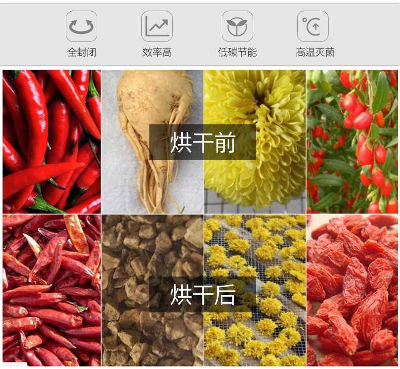 我公司全自動智能化烘干機主要用于:農(nóng)副產(chǎn)品,提高其經(jīng)濟價值,增加出口創(chuàng)匯。果蔬、果脯、肉制品、腸衣、煙葉、皮革、枸杞、烘干蔬菜類(辣椒等)、食用菌類(香菇、蘑菇、木耳等)、中藥材類(金銀花、枸杞、人參、八角等)、海產(chǎn)品類(魚、蝦、魷魚、海帶等)、鮮果類(大棗、荔枝、桂圓、核桃等)、干果等的烘干。我公司機組能效比高,經(jīng)濟節(jié)能、安全穩(wěn)定。實現(xiàn)一機多用,提高烘干機的利用率。